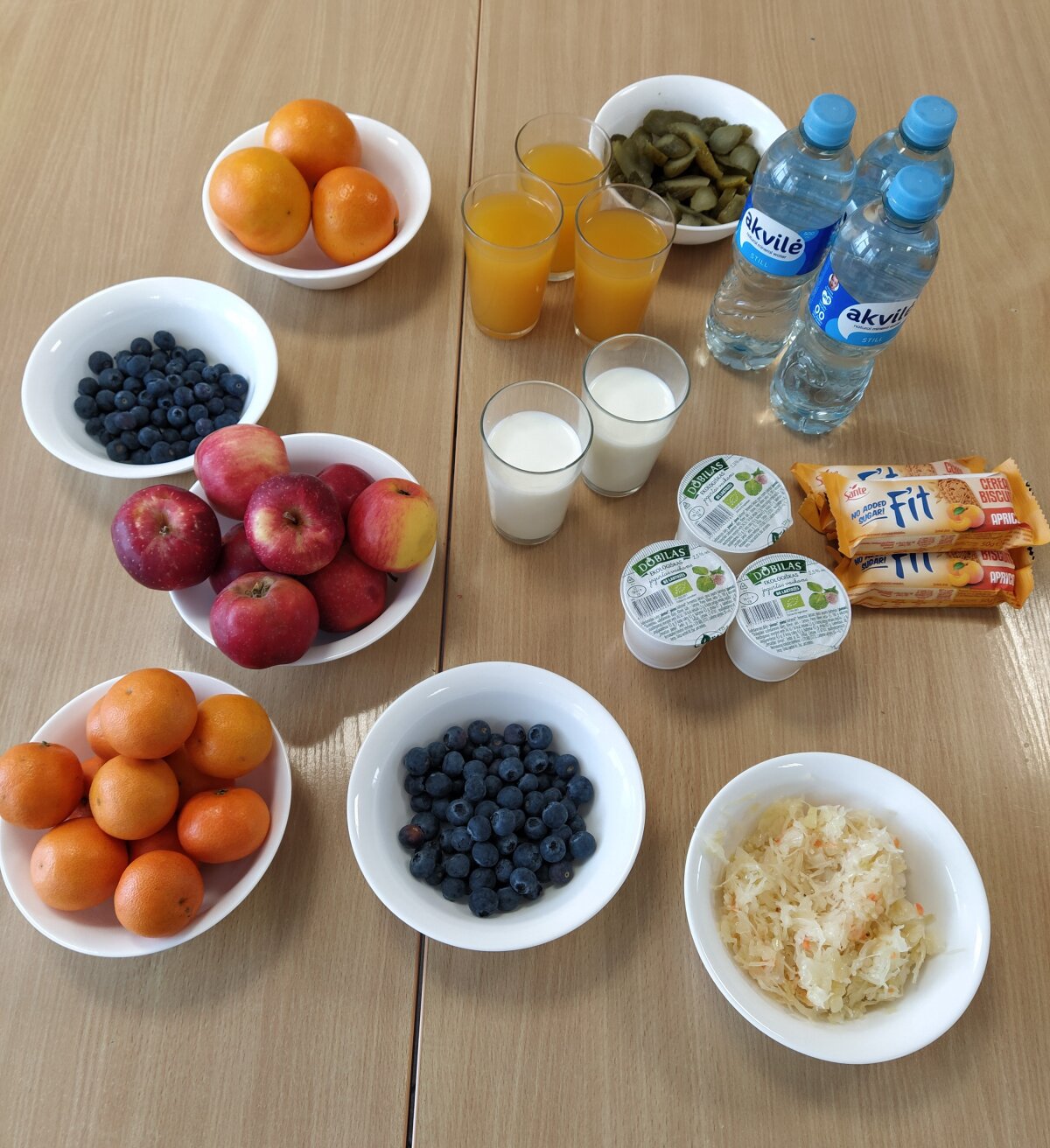 Nuotraukoje matyti gimnazijos vienos savaitės užkandžių, salotų ir vaisių pasiūla.