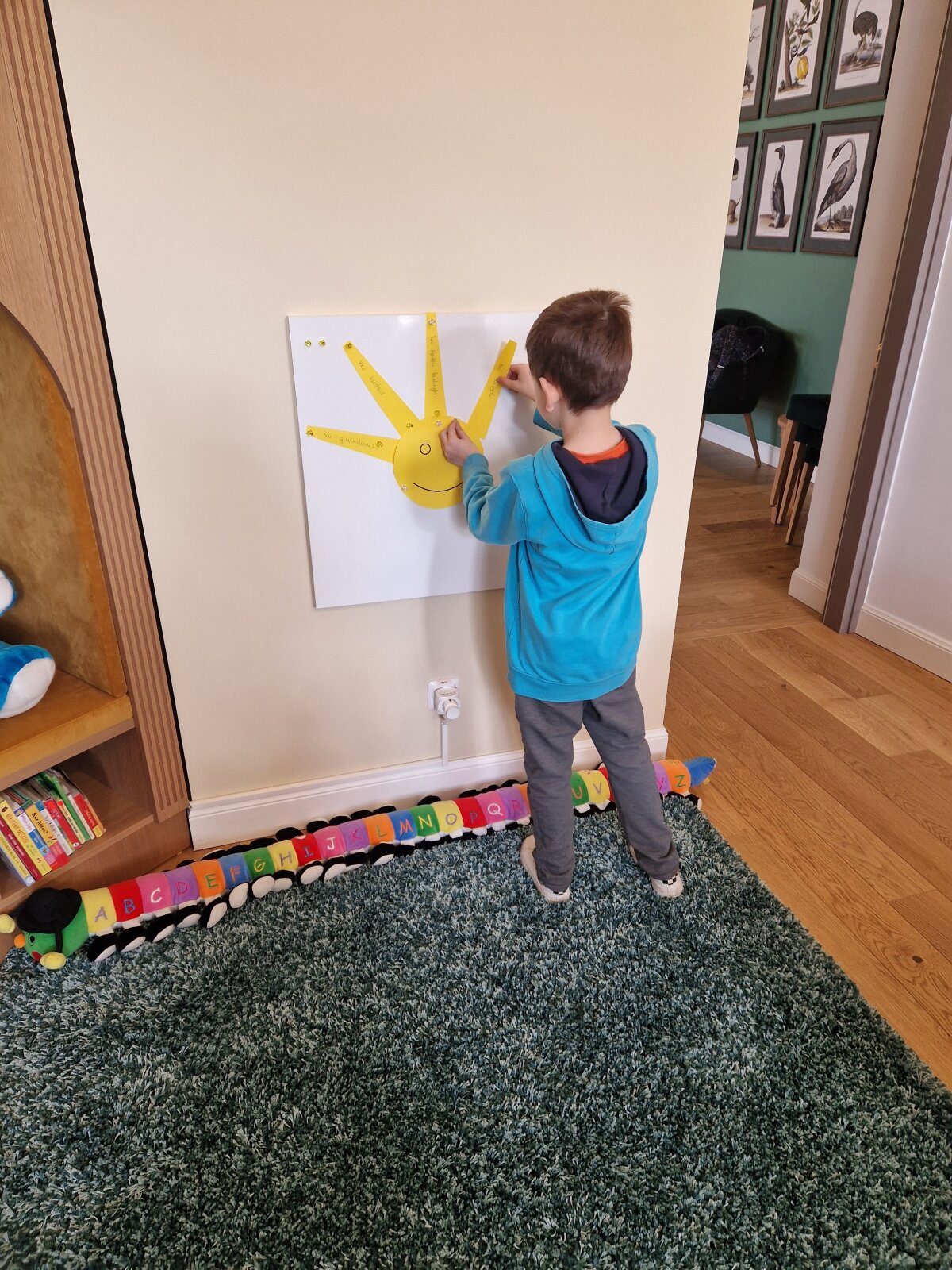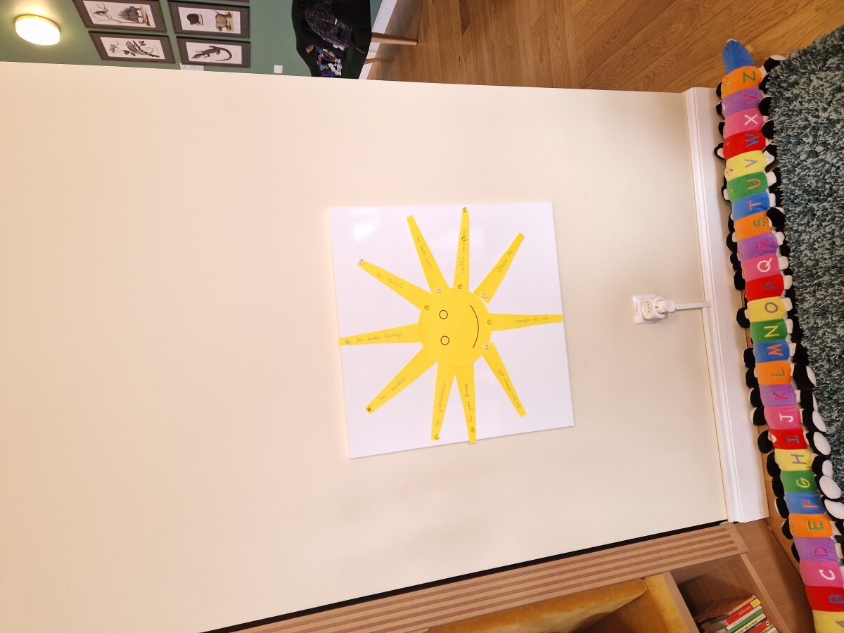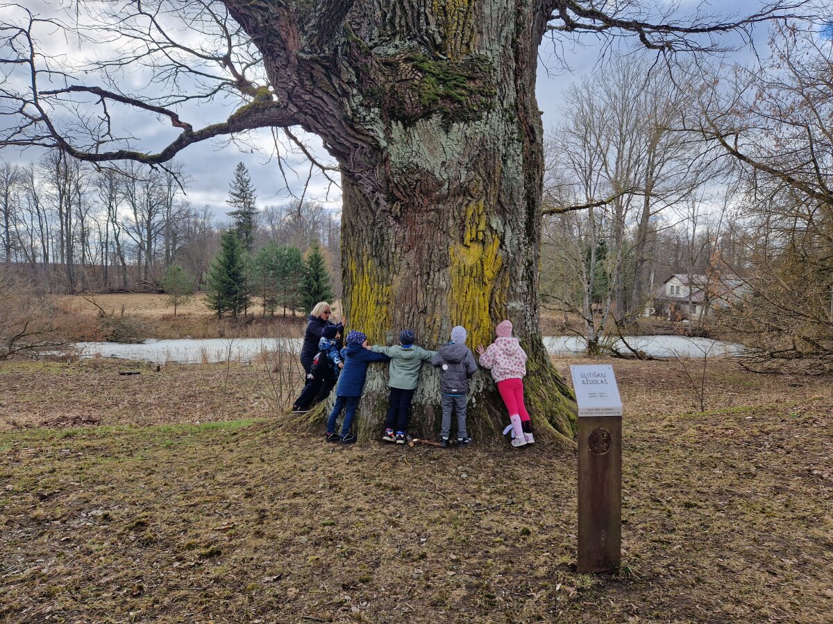 Po edukacijos aplankėme biblioteką, kurioje bibliotekininkė paskaitė knygelę „Spalvų monstriukai", o vaikai, įvardinę savo dabartinę emociją, suklijavo gražią saulutę. Papietavę aplankėme Glitiškių ąžuolą galiūną, kurį vaikai bandė apkabinti.