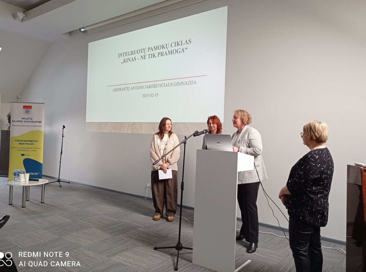 Vasario 19 d. gimnazijos komanda dalyvavo TŪM pusiaukelės konferencijoje „TŪM programa mūsų mokyklose: motyvacija kitai ir pokyčių atradimai“. Joje lietuvių kalbos ir literatūros mokytoja Vilma Putnienė, biologijos mokytoja Jūratė Guobienė, dailės mokytoja Rasuolė Rajackaitė-Kvedarė ir logopedė Renata Zarembienė skaitė pranešimą „Kinas - ne tik pramoga“ apie gimnazijoje vestą integruotų pamokų ciklą.