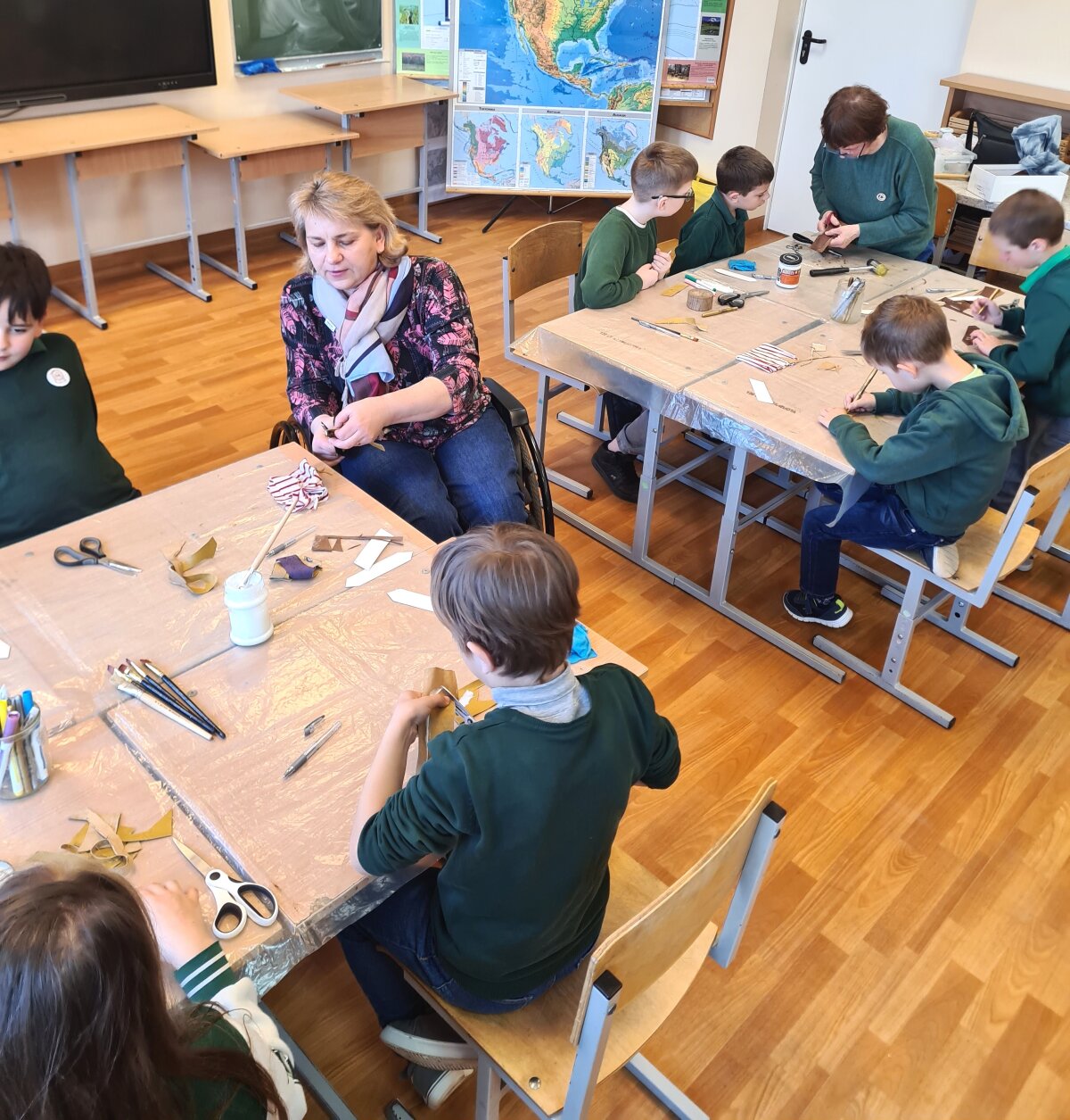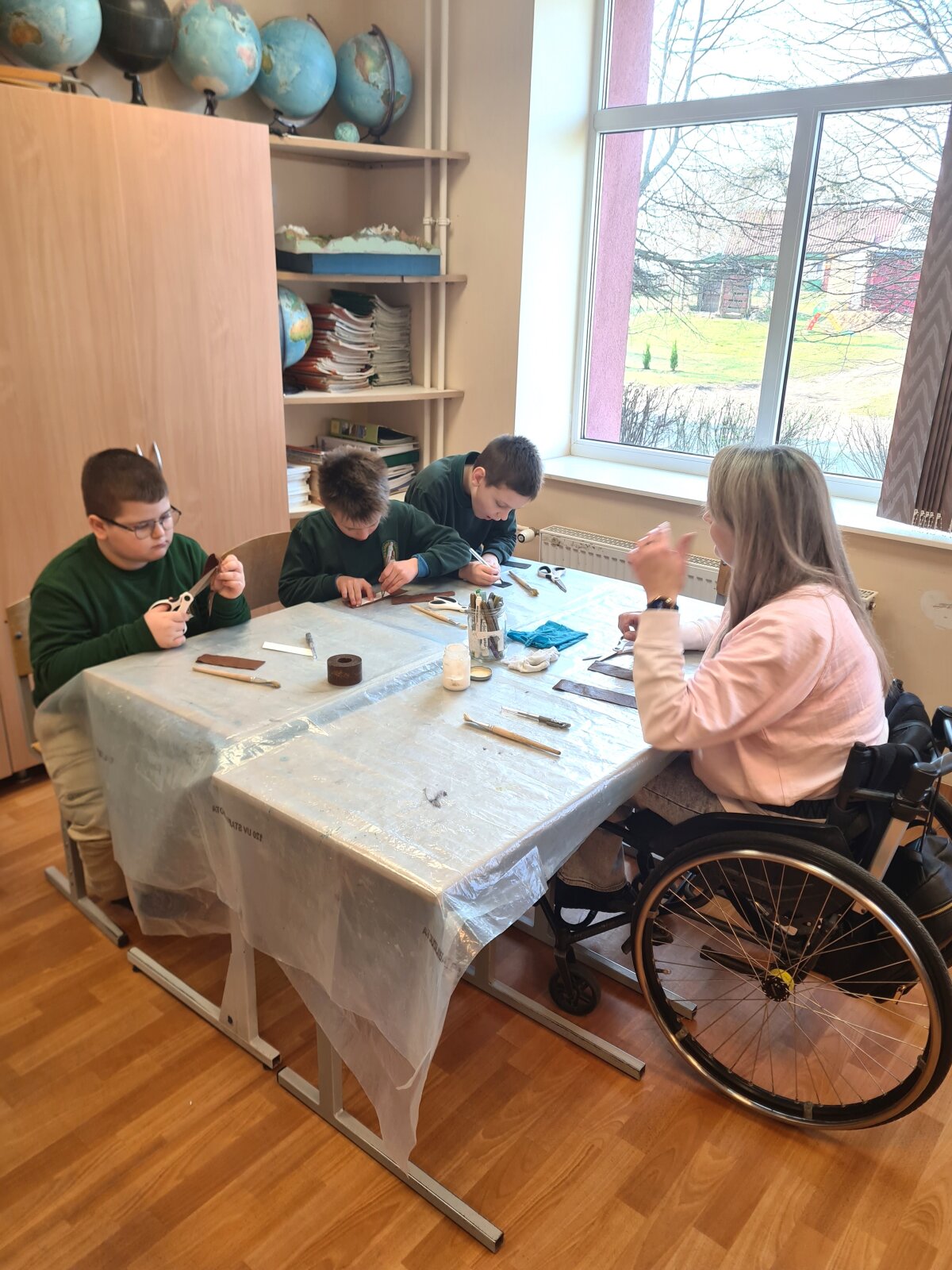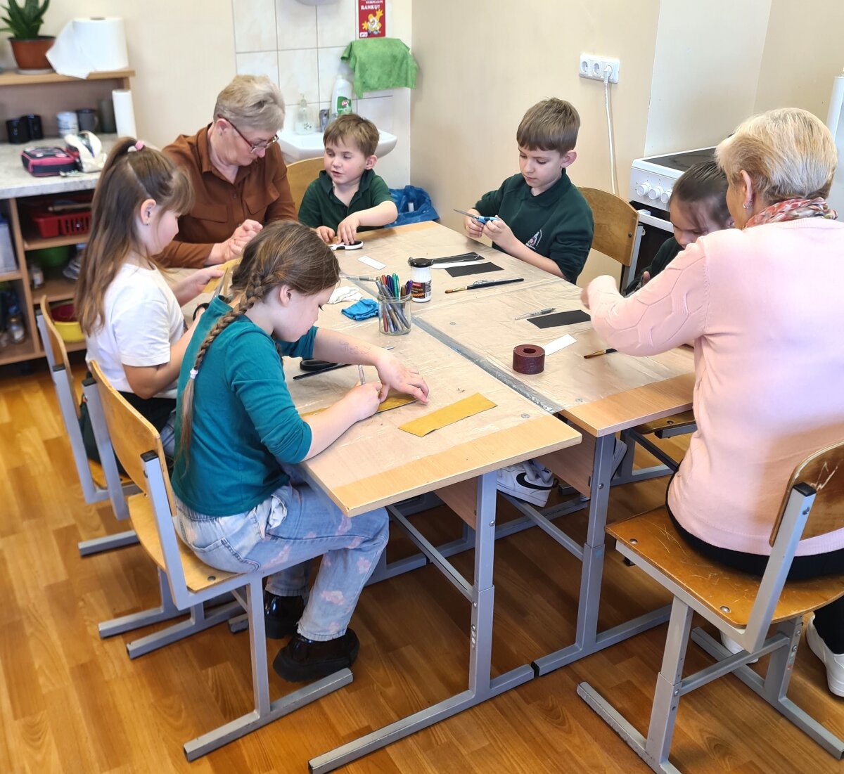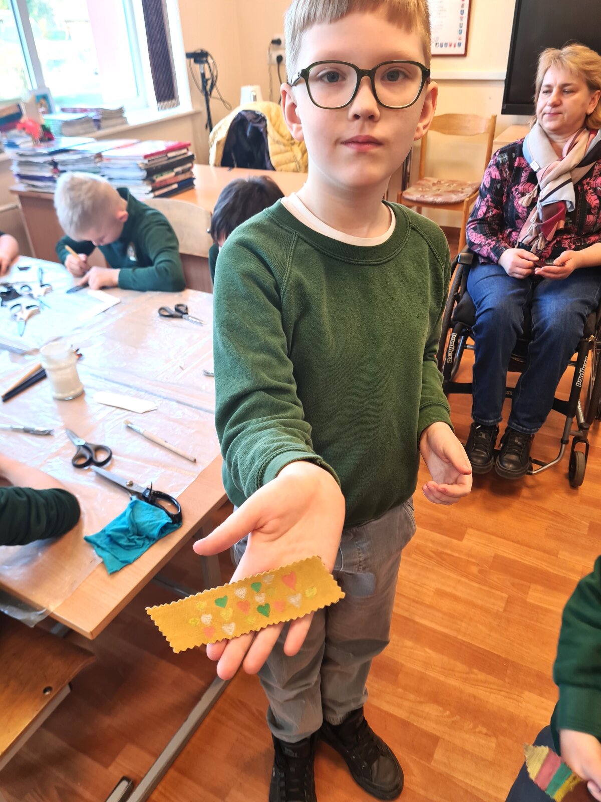 Balandžio 15 dieną, Giedraičių Antano Jaroševičiais gimnazijoje 1-4 klasėse svečiavosi programos „Tūkstantmečio mokykla“ partneriai – Molėtų krašto žmonių su negalia sąjunga. Viešnios papasakojo apie žmones su negalia: kaip jie  gyvena, dirba, kokius turi pomėgius ir kaip save realizuoja. Vėliau, amatų dirbtuvėse, mokė pradinukus pasigaminti odinius knygų skirtukus ir juos dekoruoti. Artėja pavasario atostogų metas, todėl šis autorinis darbas pravers kiekvienam skaitant knygeles Velykų atostogų metu.