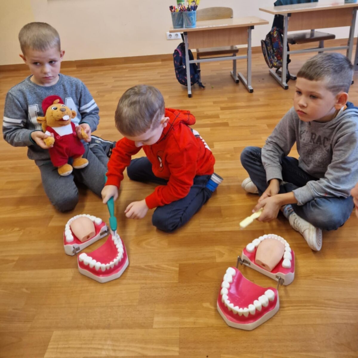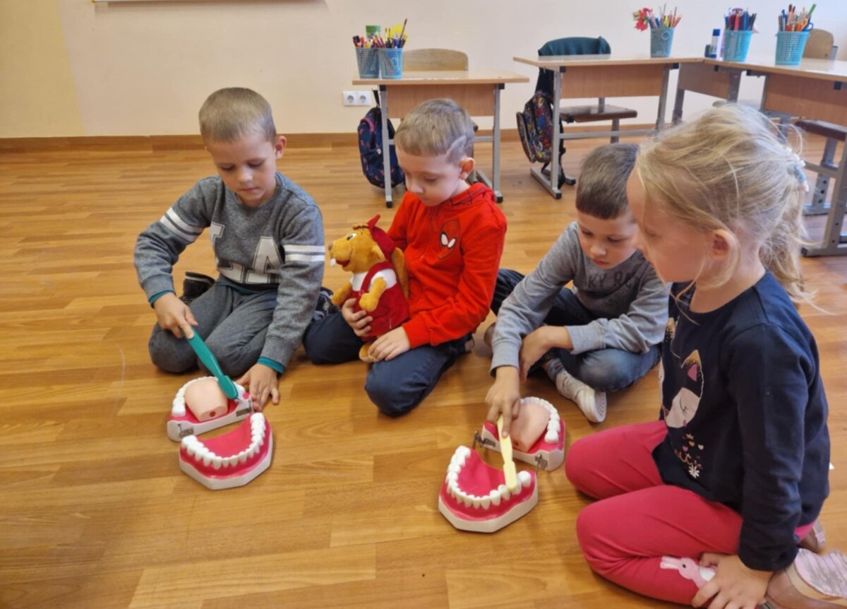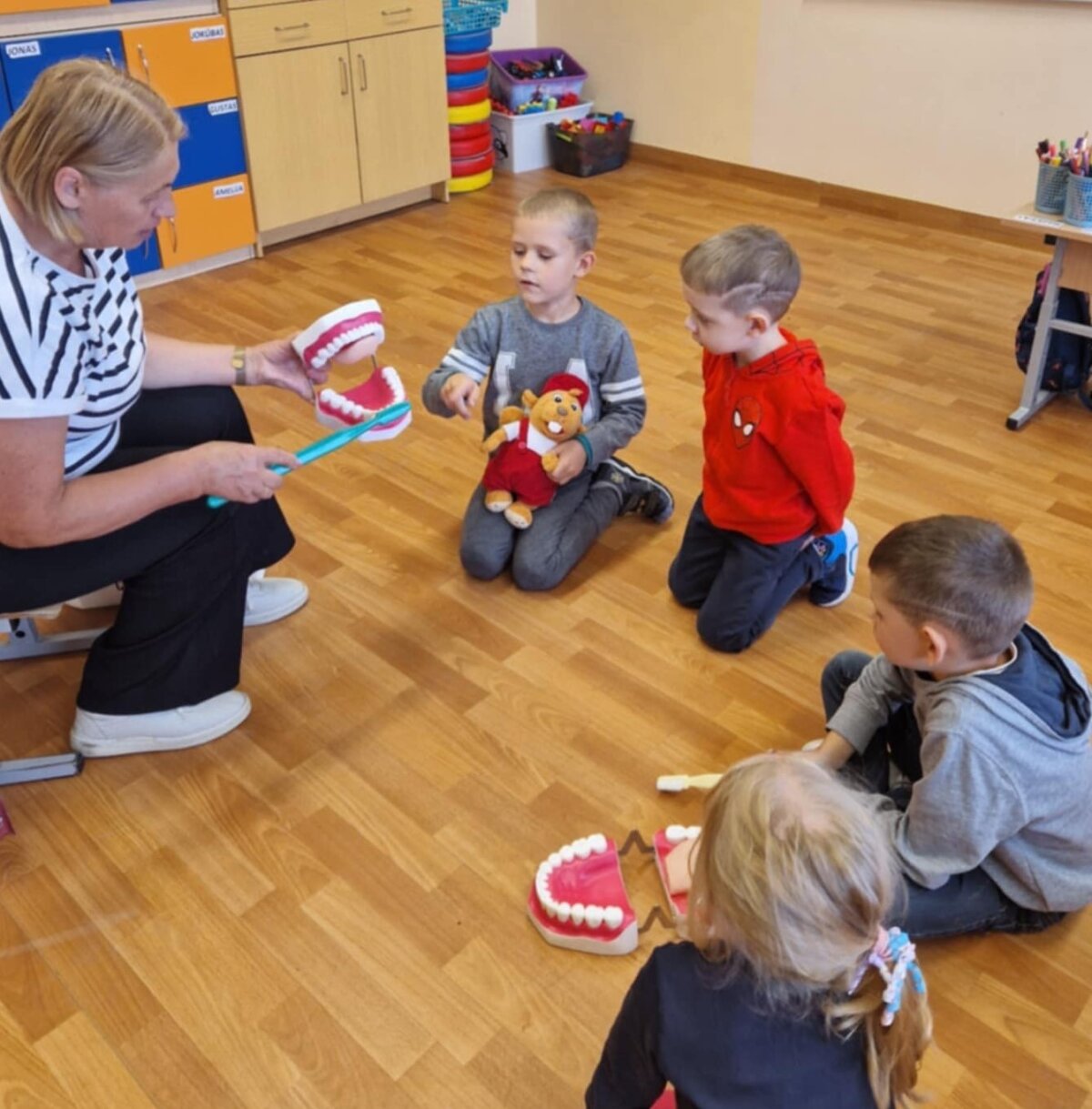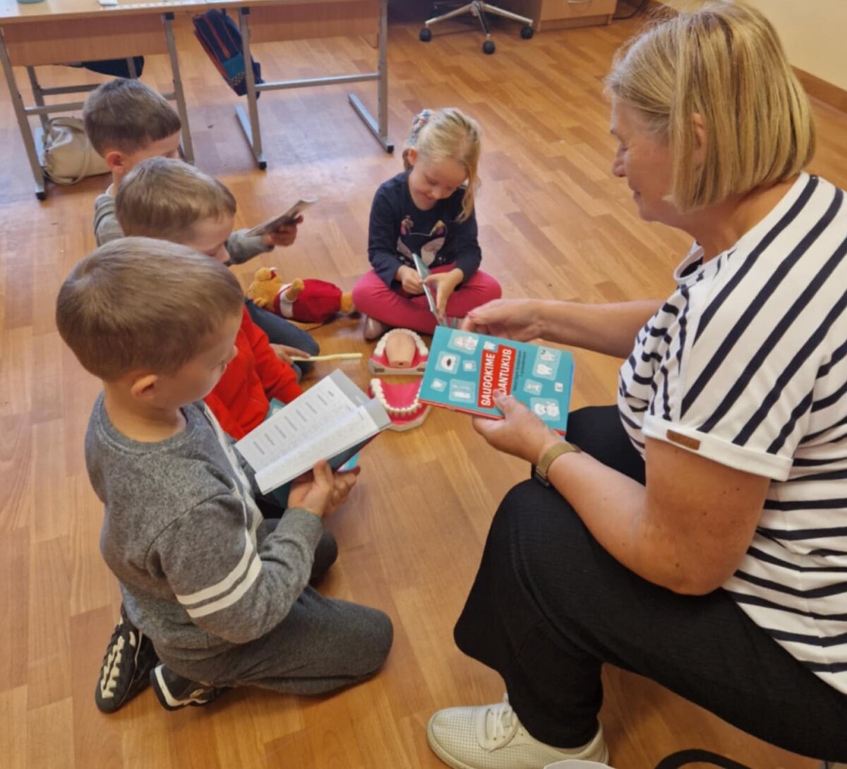 Sveikatos priežiūros specialistė Bronė Grigonienė su gimnazijos priešmokyklinės grupės vaikais aptarė dantukų priežiūrą. Užsiėmimo tikslas – atskleisti kasdienės burnos higienos svarbą, priemonių, skirtų burnos higienai svarbą; maisto įtaką; veiksnius, kurie gali nulemti burnos sveikatą ugdant teisingus įpročius ir stiprinant vaikų savivoką. Smagu, kai suprasti apie dantukų priežiūrą padeda bebras, kurio dantys yra stiprūs ir sveiki ir „protinga“ knygelė, kuri pateikia daug žinių bei užduočių.