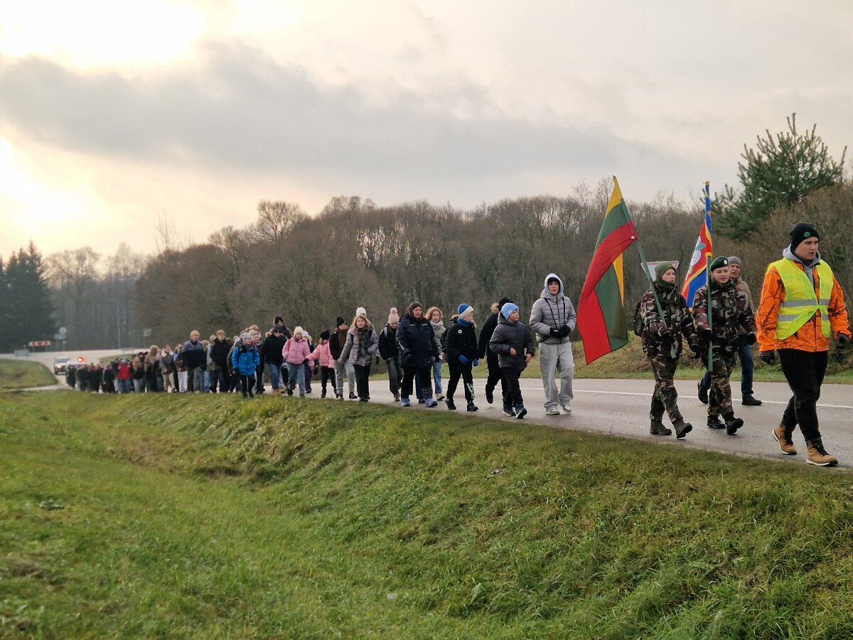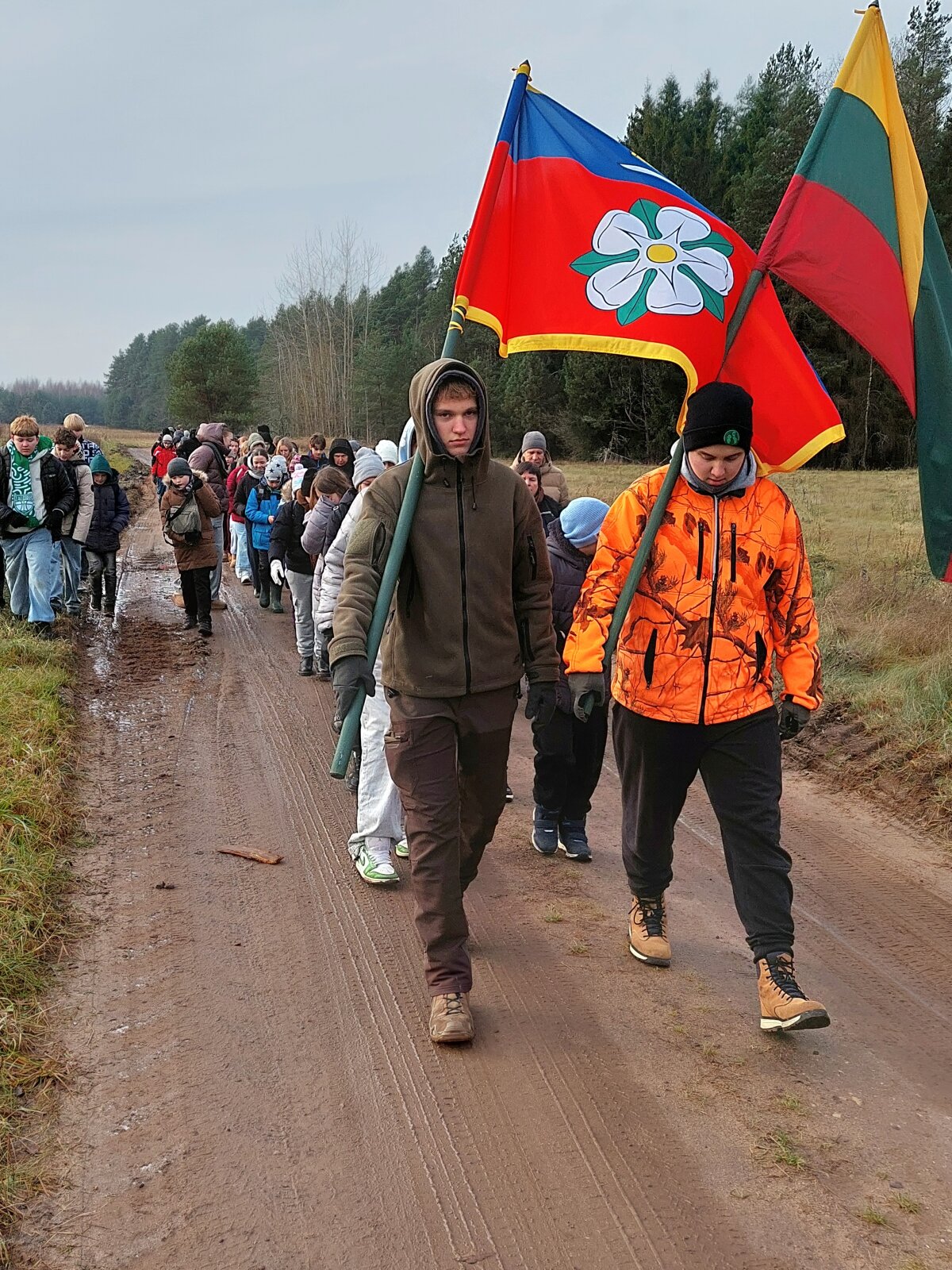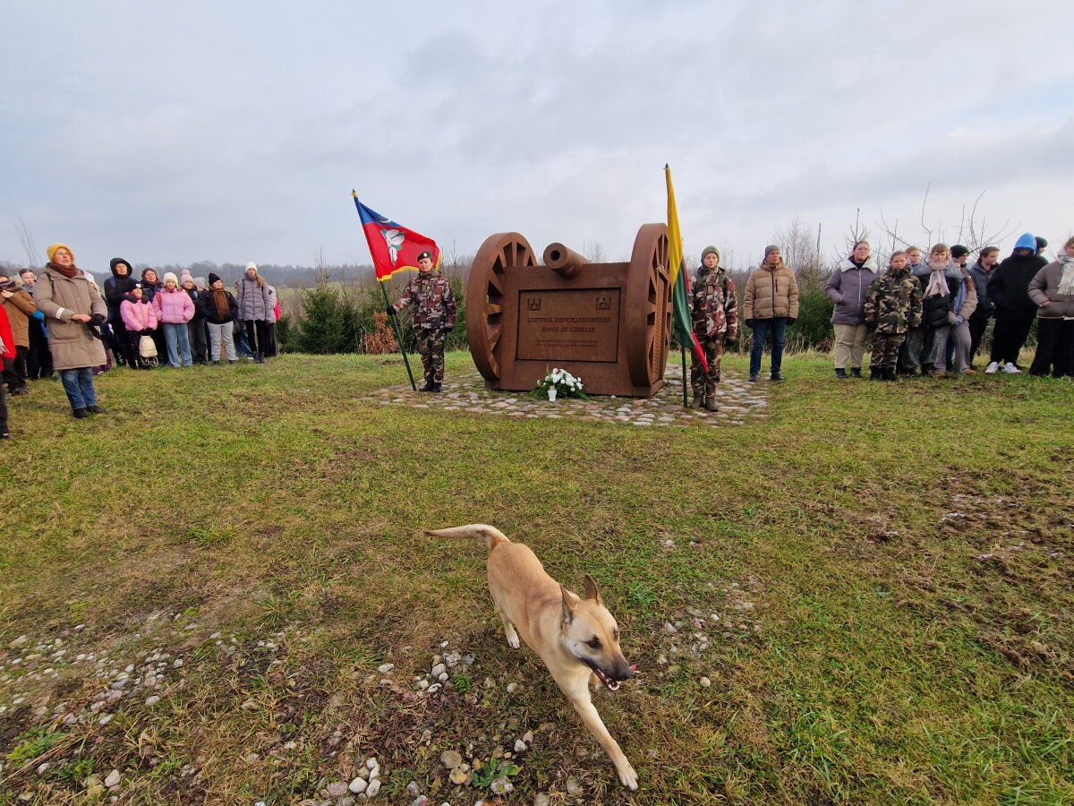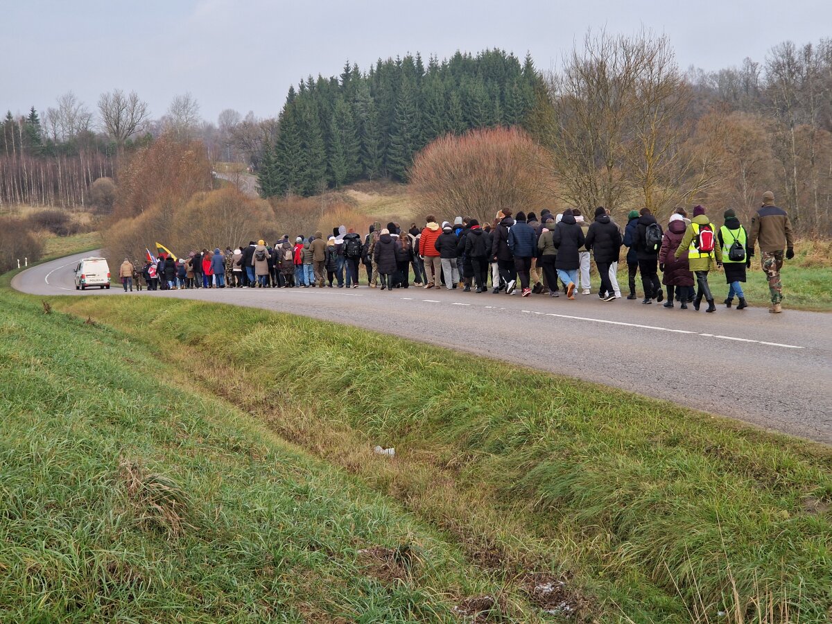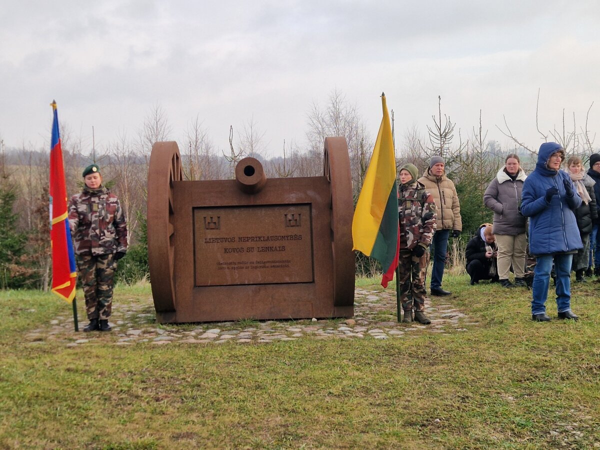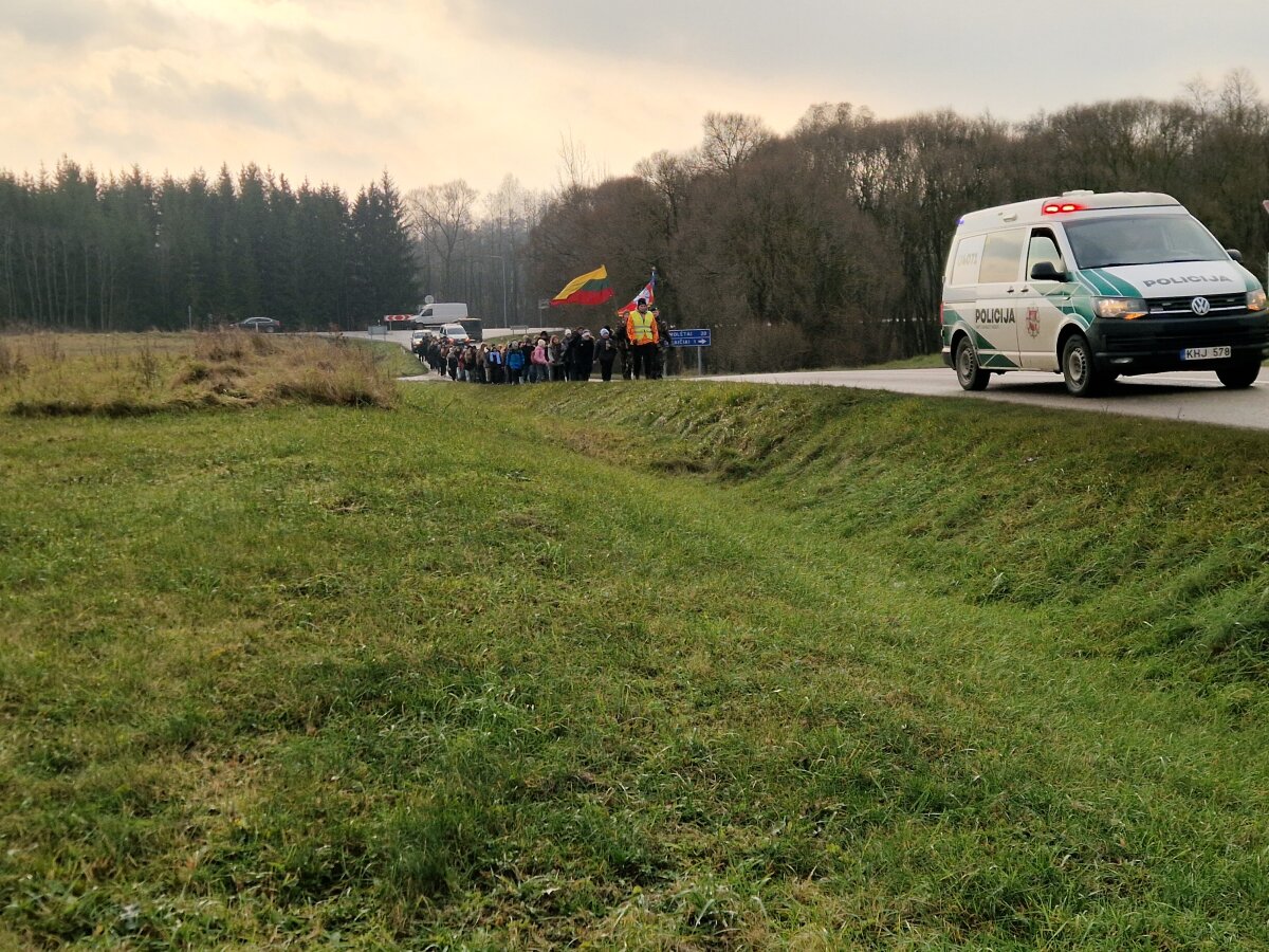 Vėliau, saugiai lydimi policijos ekipažų, žygiavome į pirmojo mūšio vietą prie Bekupės. Pakeliui sustojome ir padėjome gėlių prie nepriklausomybės kovų simbolio – stilizuoto pabūklo, skirto Giedraičių mūšio šimtmečiui paminėti.