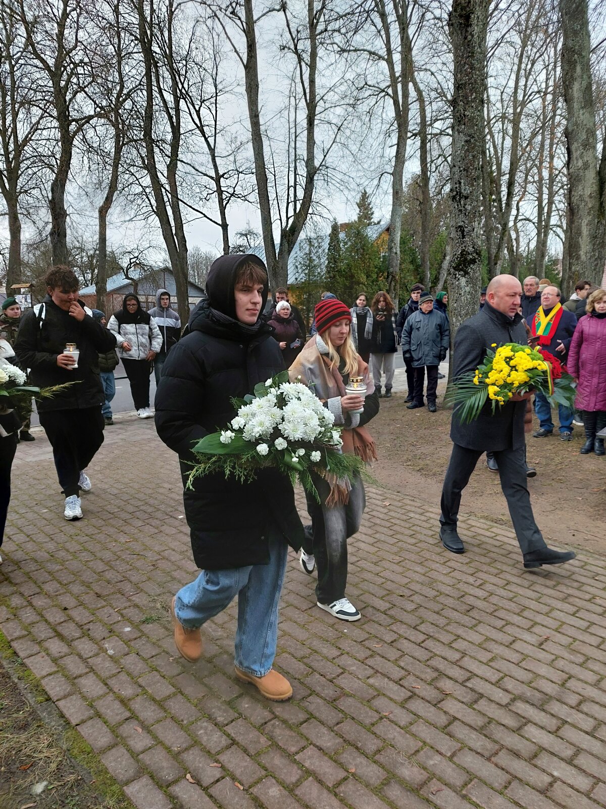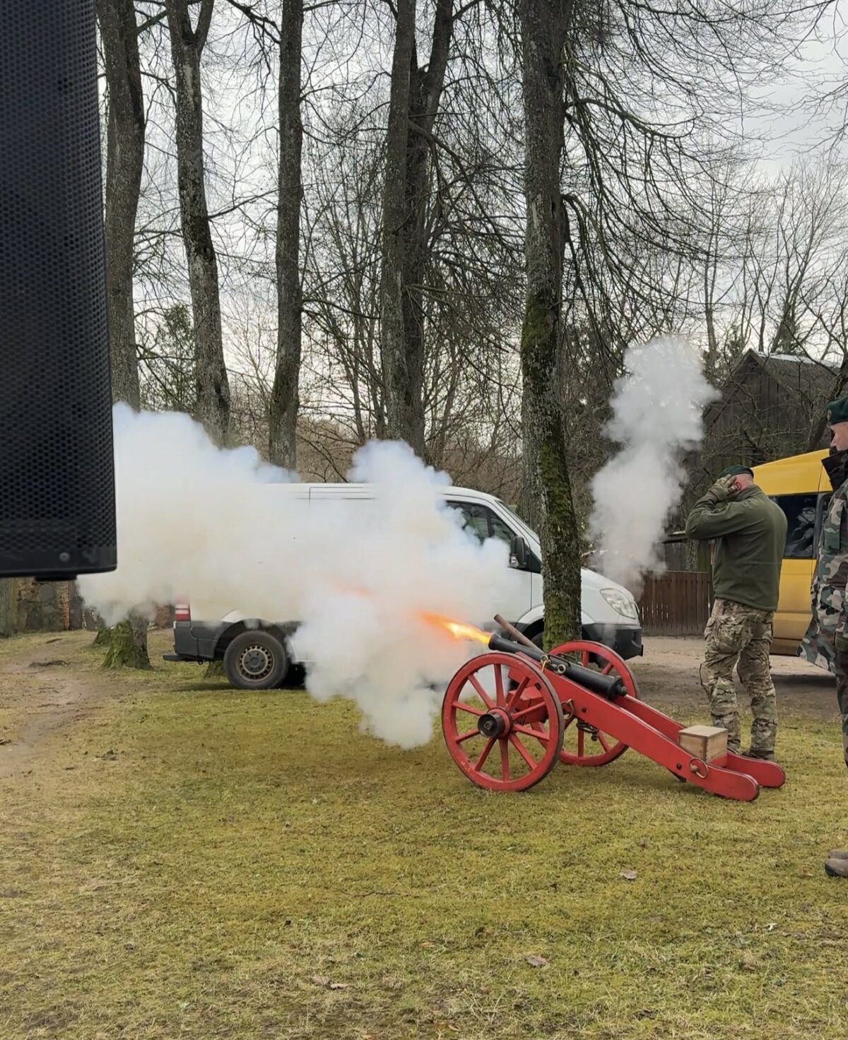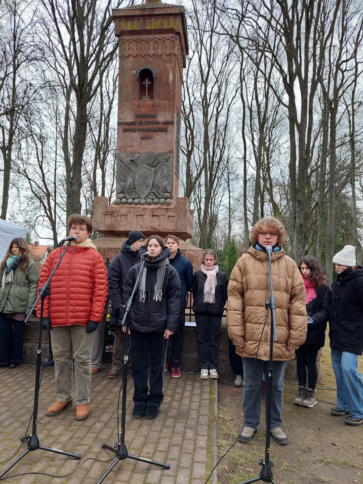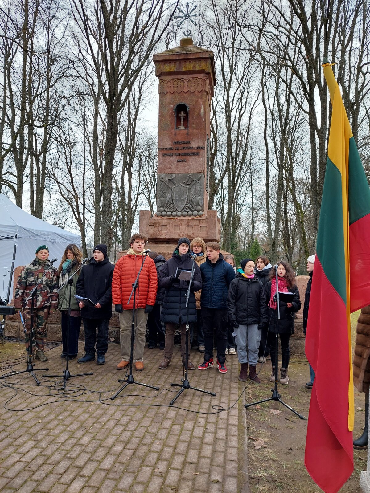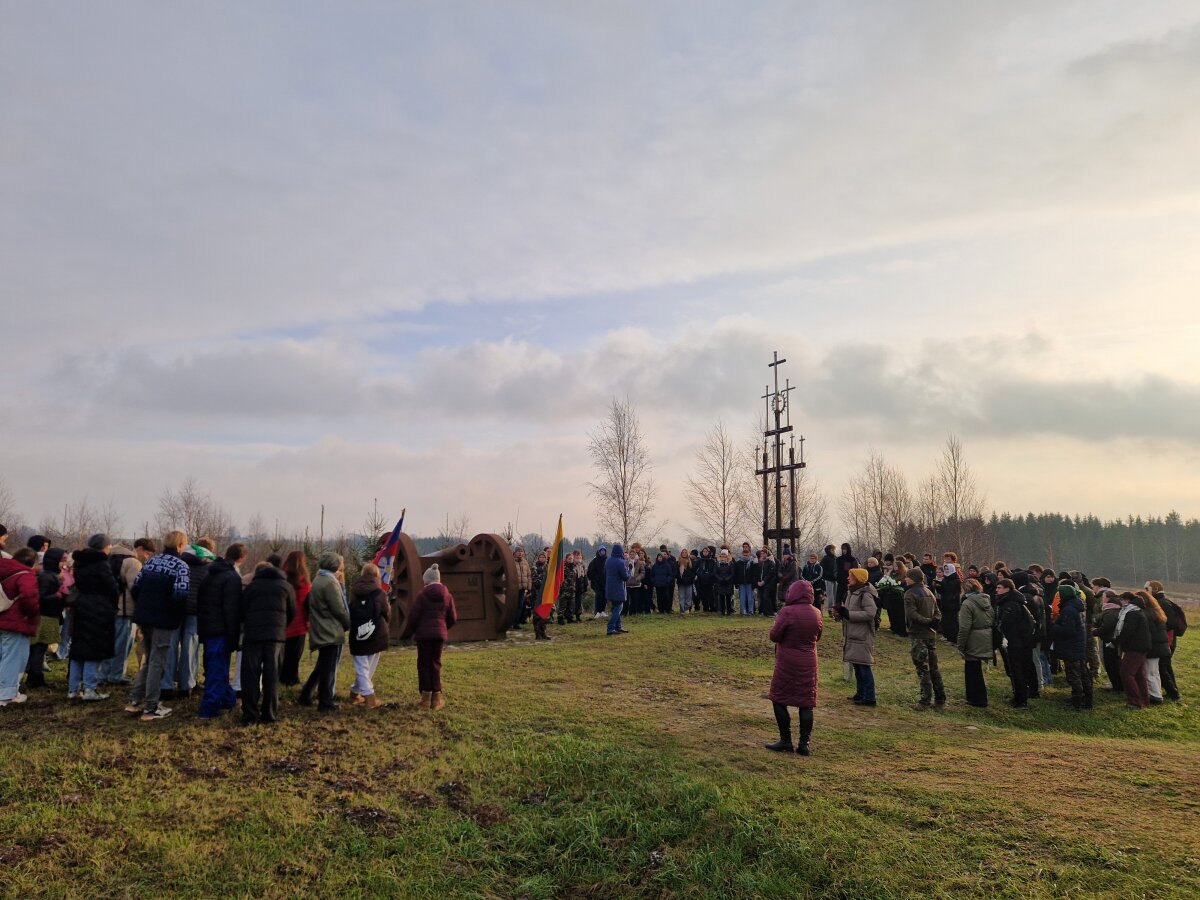 Vėliau, saugiai lydimi policijos ekipažų, žygiavome į pirmojo mūšio vietą prie Bekupės. Pakeliui sustojome ir padėjome gėlių prie nepriklausomybės kovų simbolio – stilizuoto pabūklo, skirto Giedraičių mūšio šimtmečiui paminėti.