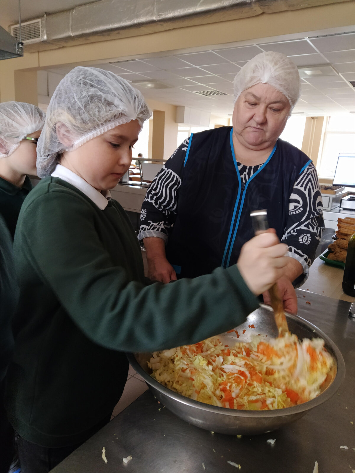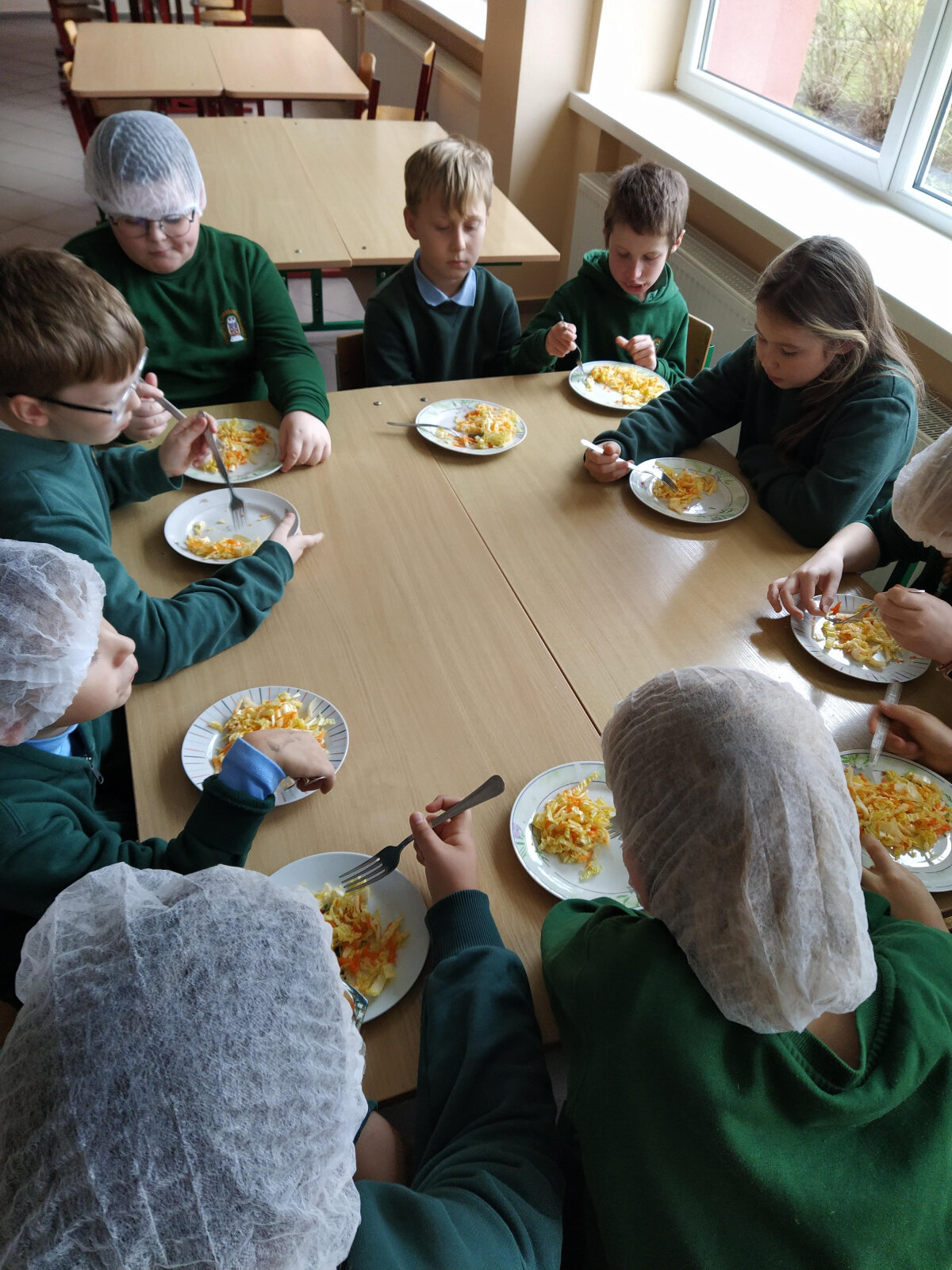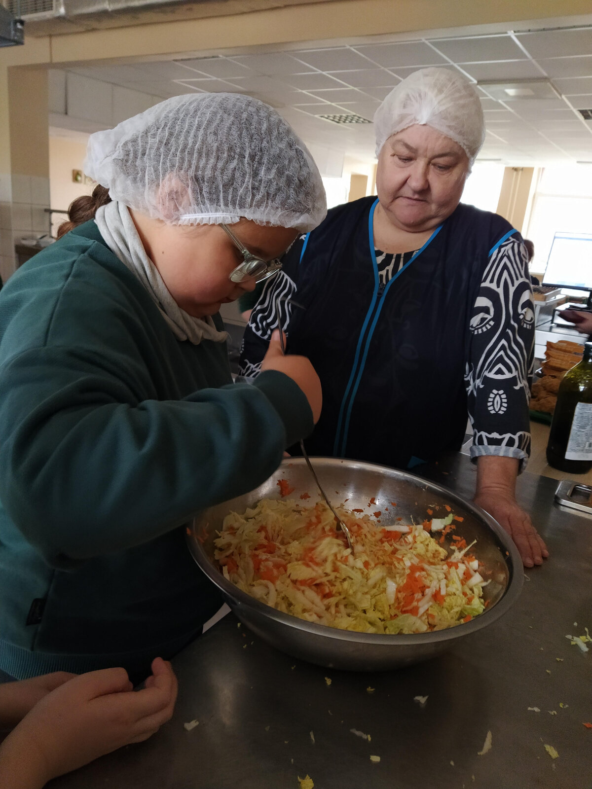Trečiokai apsilankė gimnazijos valgykloje, kur kalbėjosi su virėjomis, domėjosi kaip vyksta mokinių maitinimo darbai, uždavė daug klausimų bei susipažino su vaisiais ir daržovėmis iš arčiau gamindami sveikuoliškas salotas. Vieni skuto daržoves, kiti pjaustė ir tarkavo, dar kiti maišė, o pagaminę su malonumu jas suvalgė. Pasisotinę nutarė, kad reikia valgyti daugiau šviežių vaisių ir daržovių, nes naudinga.