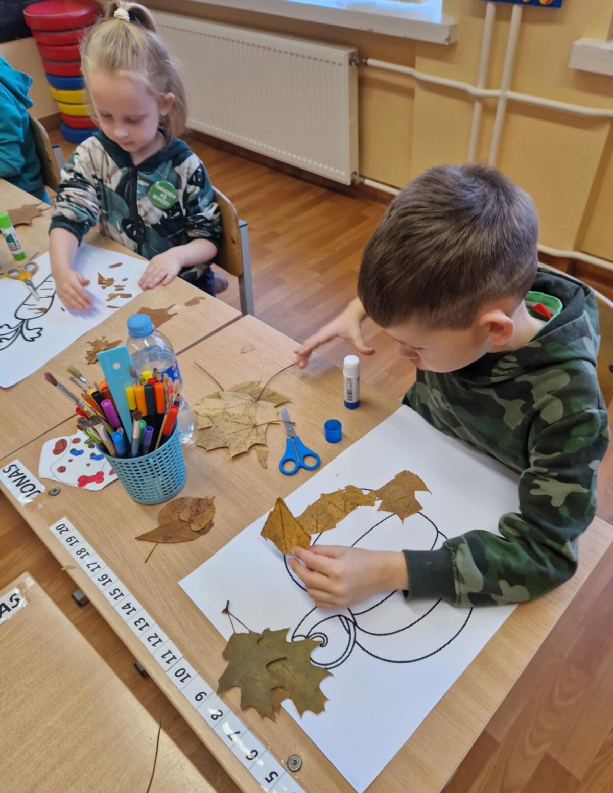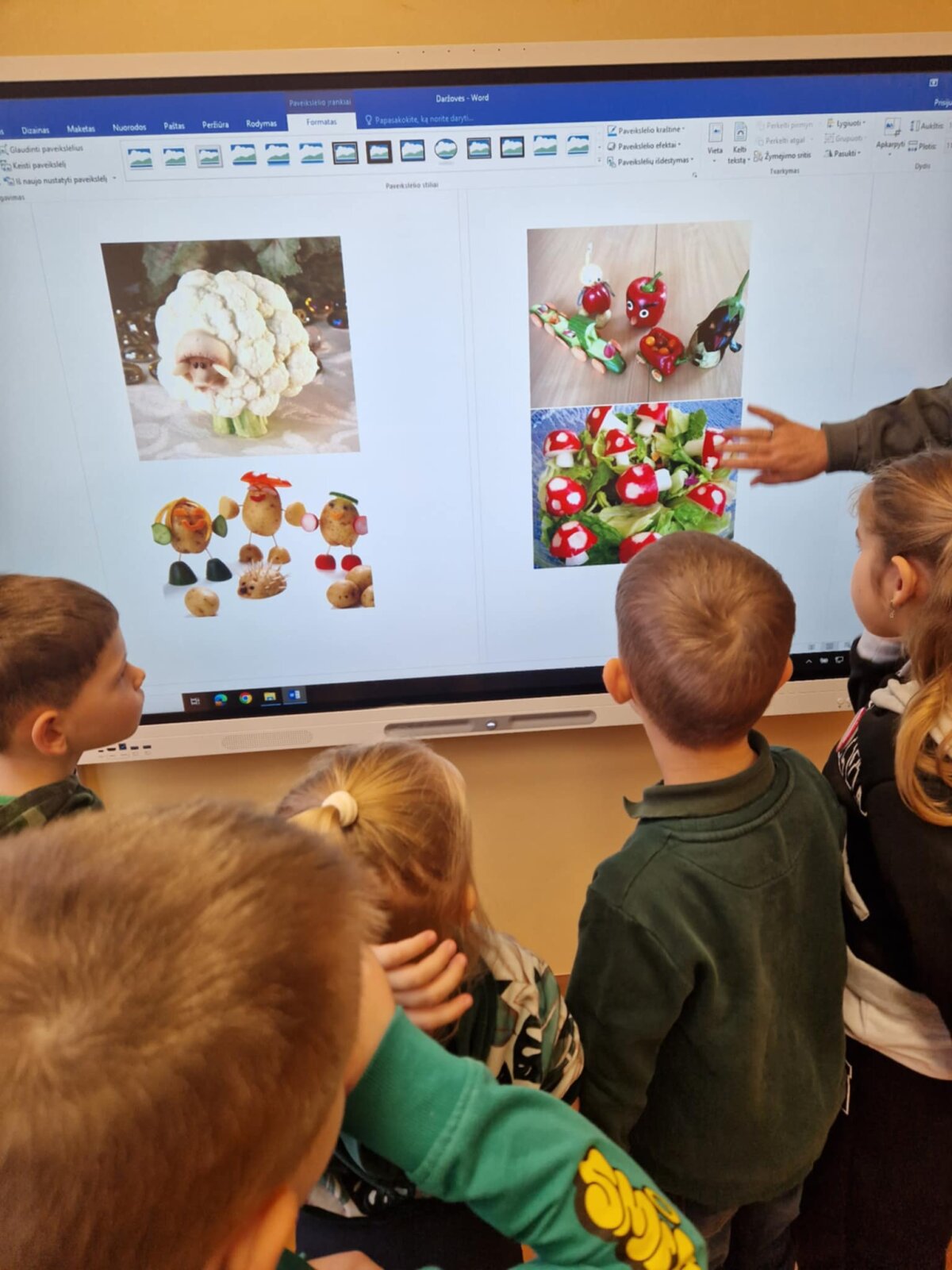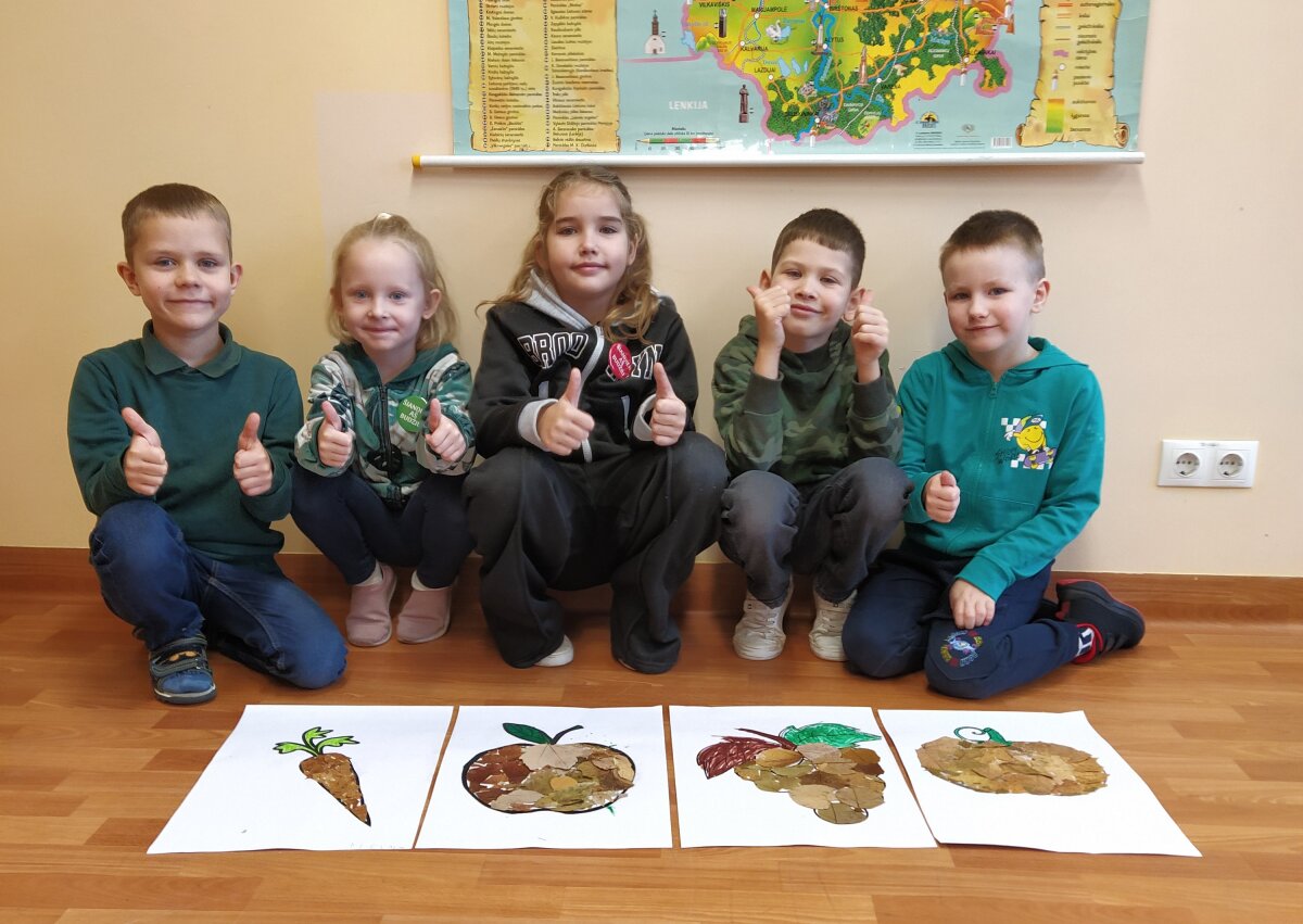 Mažieji vaikai, susipažinę su vaisiais ir daržovėmis, aptarę jų išvaizdą bei naudą, žaidė žaidimus, kūrė meninius darbelius.