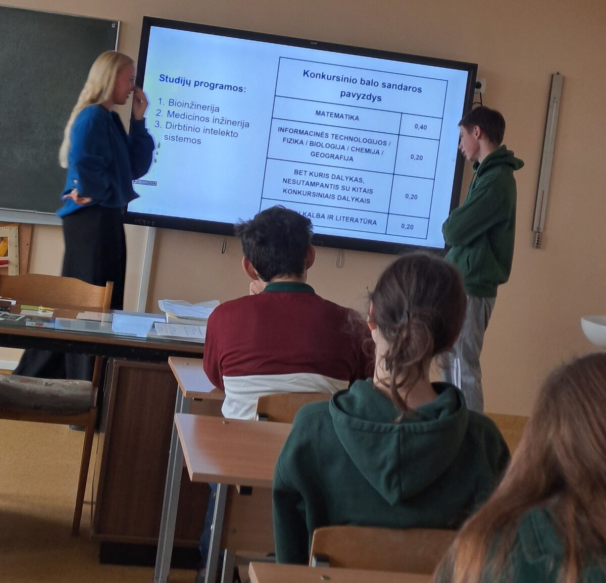 Moksleiviai aktyviai dalyvavo pokalbyje, kėlė klausimus apie karjeros planavimą, studijų krypties pasirinkimo įtaką ateičiai, dalinosi patirtimis.